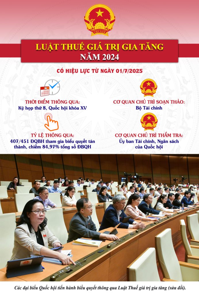 Luật Thuế giá trị gia tăng (GTGT) năm 2024 gồm 4 chương, 18 điều, có hiệu lực từ ngày 01/7/2025. Ngoài những nội dung kế thừa quy định Luật hiện hành, những nội dung mới được sửa đổi, bổ sung chủ yếu liên quan tới người nộp thuế, đối tượng không chịu thuế GTGT, giá tính thuế, thuế suất, khấu trừ thuế GTGT đầu vào… Cổng Thông tin điện tử Quốc hội trân trọng giới thiệu 6 điểm mới nổi bật của Luật Thuế GTGT năm 2024: