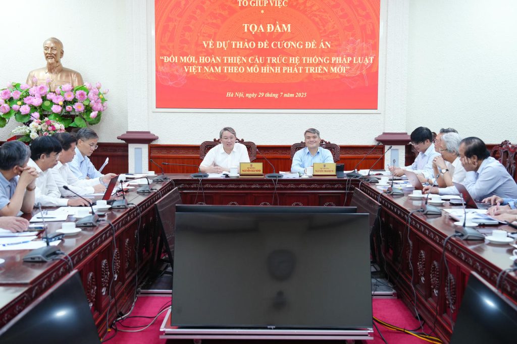 (PLVN) – Ngày 29/7, Tổ Giúp việc của Ban Chỉ đạo Trung ương về hoàn thiện thể chế, pháp luật đã tổ chức Toạ đàm về dự thảo Đề cương Đề án Đổi mới, hoàn thiện cấu trúc hệ thống pháp luật Việt Nam theo mô hình phát triển mới. Bộ trưởng Bộ Tư pháp Nguyễn Hải Ninh chủ trì Toạ đàm. Thứ trưởng Nguyễn Thanh Tú cùng dự.